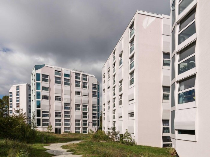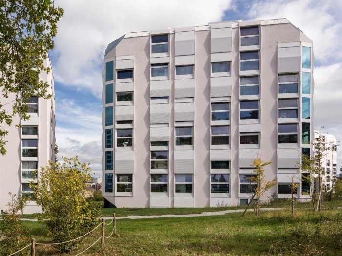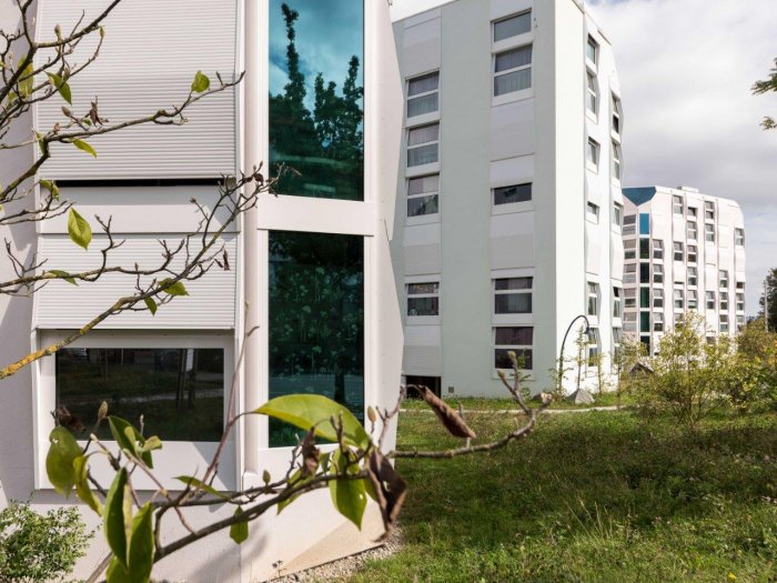 Das Grundstück in Zürich-Altstetten liegt am Fusse des Üetlibergs an nördlicher Hanglage in einem durchmischten Quartier. Die sieben Häuser haben die Form eines senkrecht halbierten Würfels und umfassen 104 Wohnungen sowie einen Kinderhort.
